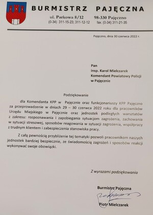 Komendant Powiatowy Policji w Pajęcznie insp. Karol Mielczarek otrzymał od Burmistrza Pajęczna Pana Piotra Mielczarka podziękowanie za przeprowadzenie szkoleń z pracownikami Urzędu Gminy i Miasta w Pajęcznie. Ideą tych spotkań było podniesienie świadomości pracowników urzędu w kwestii zagrożeń, sytuacji kryzysowych i organizacji stanowisk pracy.